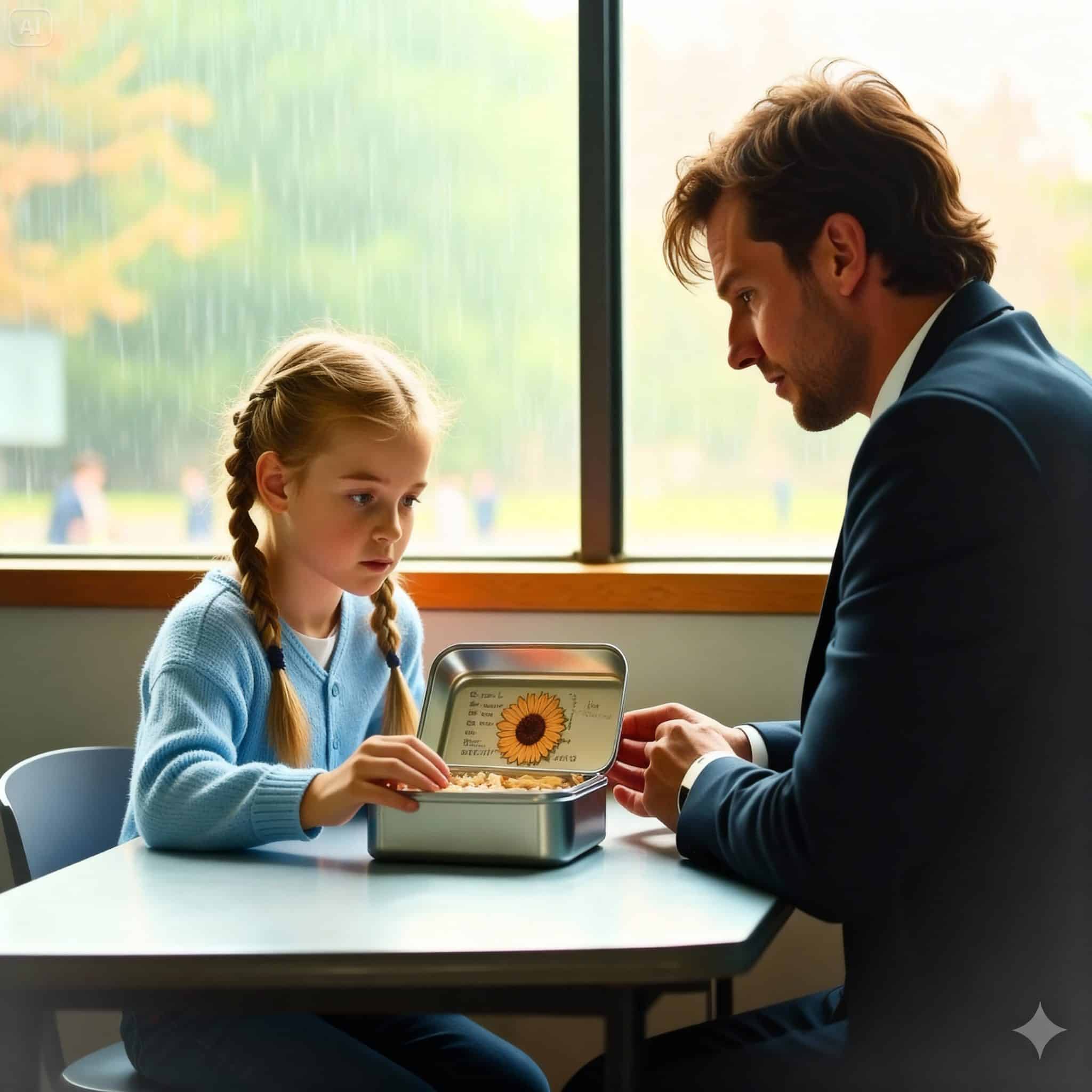 Doch als er sich zum Gehen wandte, erfasste ihn etwas durch das Fenster der Schulkantine. Ein kleines Mädchen saß allein da, die dünnen Schultern über einem verblichenen Metall-Lunchpaket von jahrelangem Gebrauch gebeugt. Zuerst dachte er, sie würde auf jemanden warten. Die anderen Kinder lachten, tauschten Snacks, ihr Geplapper hallte von den Fliesenböden wider, aber sie gesellte sich nicht zu ihnen.