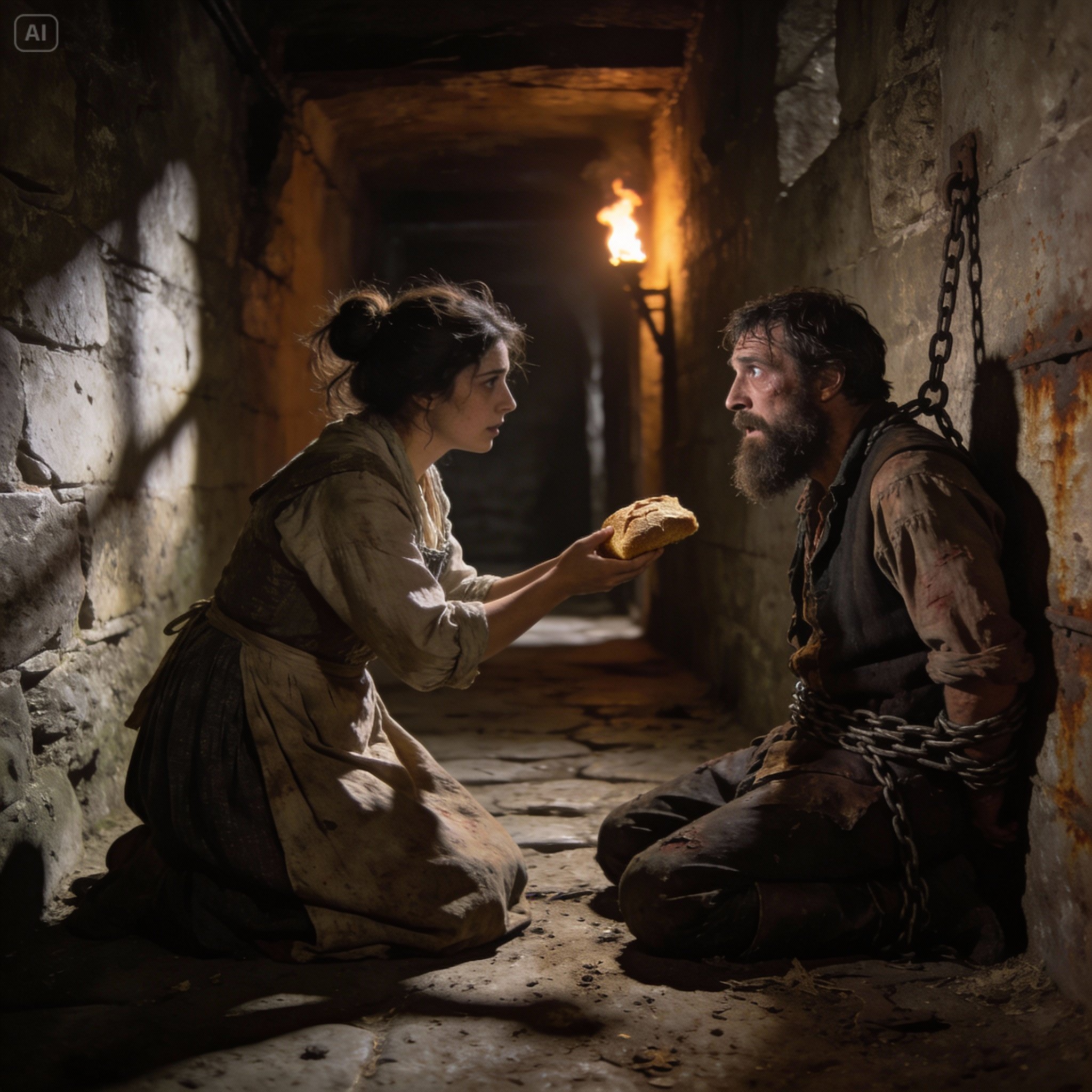 —No, mamá. Es el hombre. Hay un hombre en las mazmorras de la casa consistorial. —Su voz temblaba, pero no de miedo, sino de una compasión urgente—. Está llorando, mamá. Está encadenado y tiene mucha hambre.