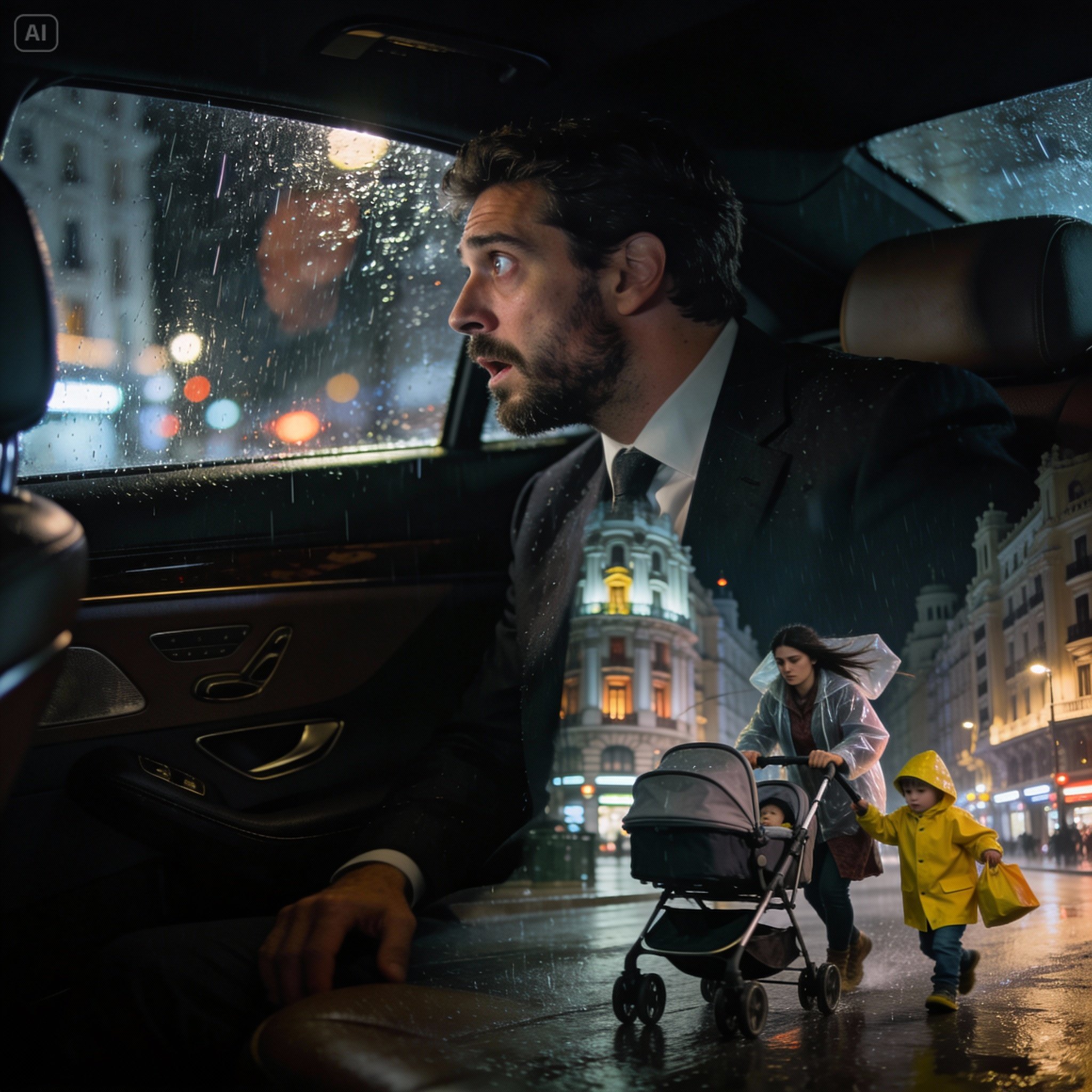 El semáforo cambió para los peatones. La mujer se lanzó hacia adelante, empujando el carrito con una mano, arrastrando al niño con la otra. Al entrar en el haz de luz de los faros del Mercedes, levantó la vista solo por un segundo.
