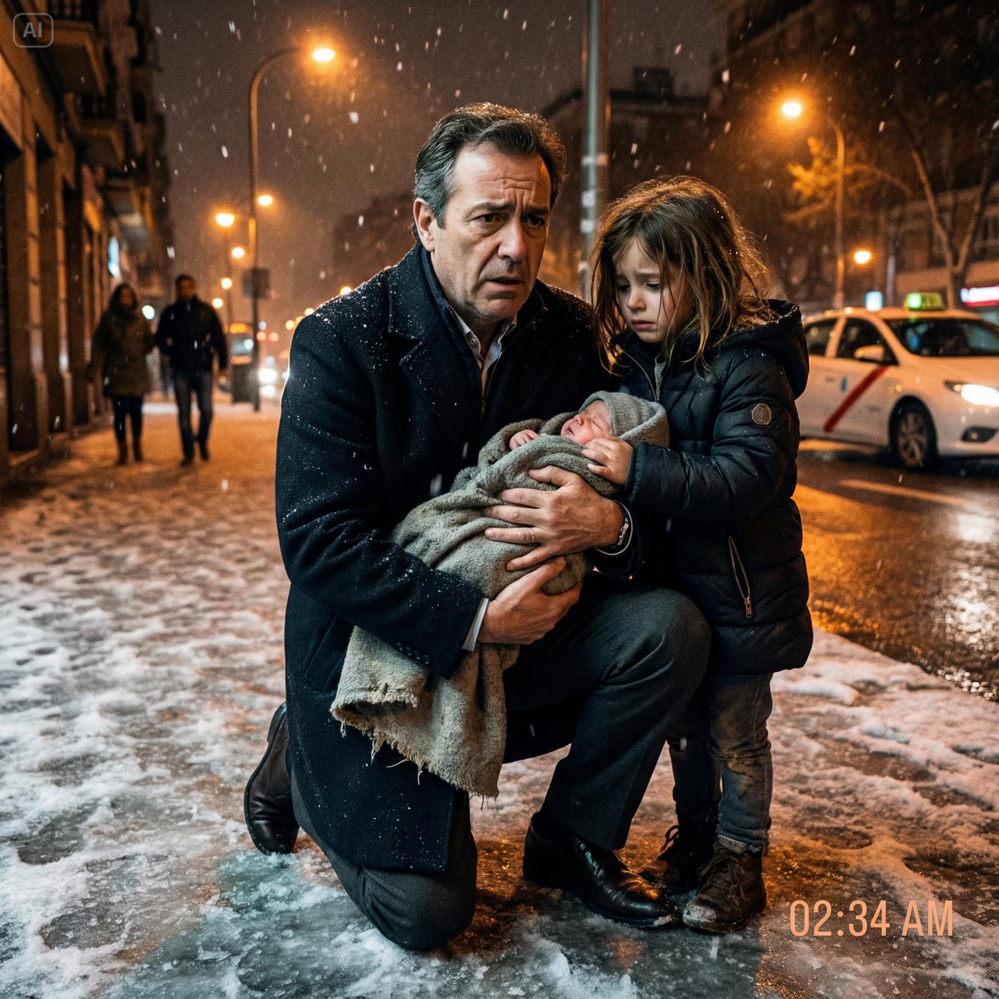 Una niña pequeña, de no más de siete años, envuelta en un abrigo tan fino que parecía más una camisa. Su pelo se pegaba húmedo contra sus mejillas, mechones congelados enmarcando una cara casi azul por el frío. Y en sus brazos —mi pecho se apretó por reflejo— había un bebé. Lánguido. Inmóvil. Tan pequeño que la manta que lo rodeaba parecía que podría tragárselo entero.