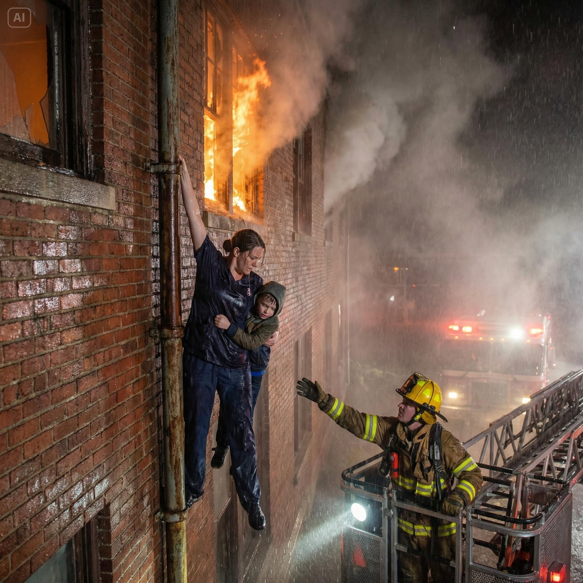 Las manos enguantadas del bombero atraparon las muñecas del niño. El impacto casi saca al bombero de la cesta, pero aguantó. Tiró de Leo hacia adentro, abrazándolo contra el suelo de la plataforma.