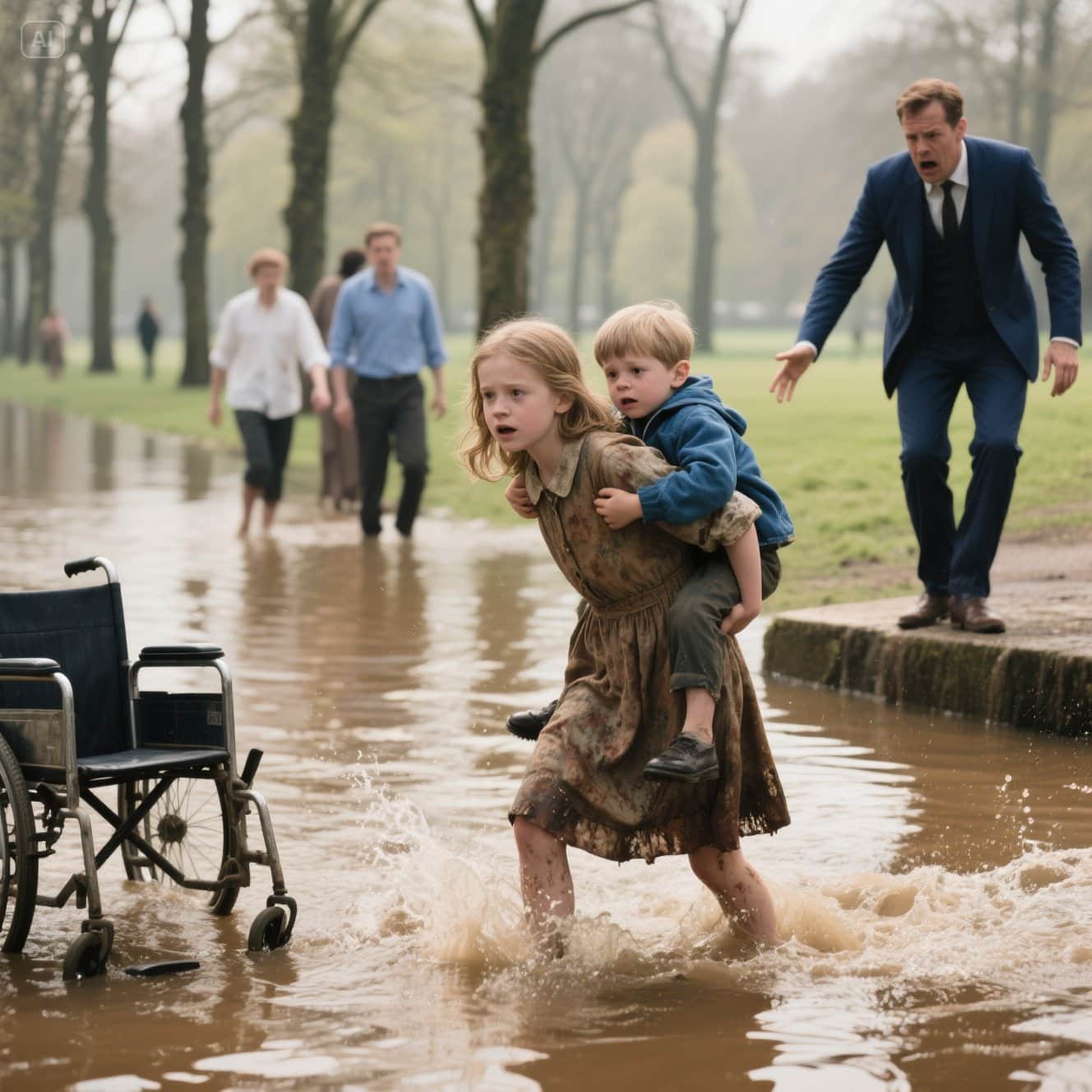 La vocecita de Ana, apenas seis años y ya llena de una determinación que la vida le había enseñado a la fuerza, cortó el aire húmedo del parque. Se agachó, sus zapatillas gastadas hundiéndose en el lodo espeso que bordeaba el estanque ornamental. Sus delgados brazos se tensaron, tirando con desesperación de la pequeña silla de ruedas atascada en un charco traicionero.