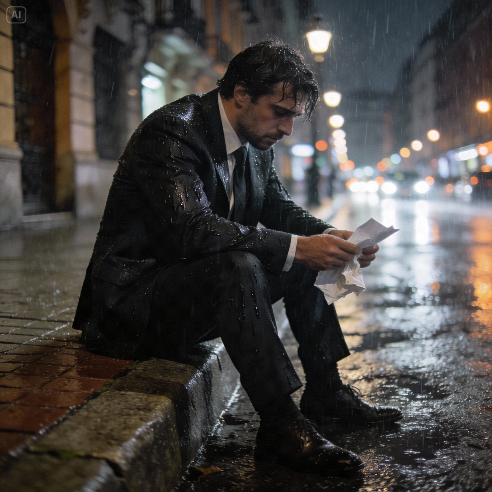 Apreté el billete con fuerza hasta que mis nudillos se pusieron blancos. Un sollozo se formó en mi pecho, algo irregular y doloroso que no podía reprimir. Me recosté contra la fría piedra de la pared del hotel, deslizándome hasta quedar agachado en el pavimento mojado, ignorando el frío que me calaba los huesos.