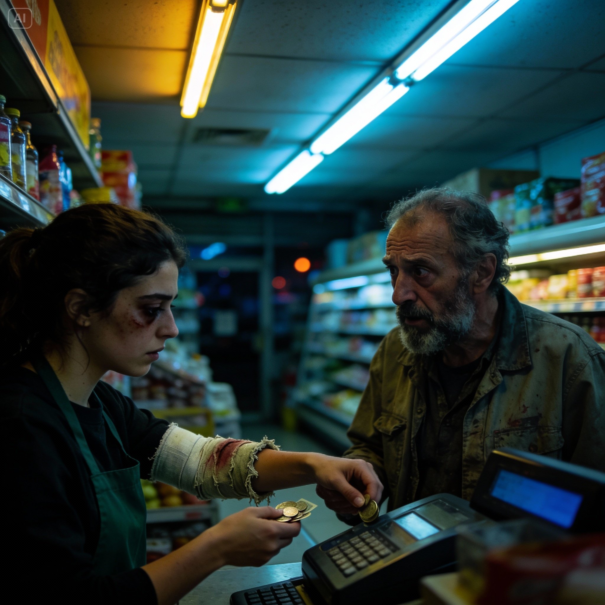 Sara estaba en la caja tres. Su cabestrillo improvisado ya estaba empapado de sudor por el esfuerzo de escanear y embolsar con una sola mano. La cámara de seguridad sobre su estación colgaba inútil, con un cartel de “MANTENIMIENTO” pegado con celo.