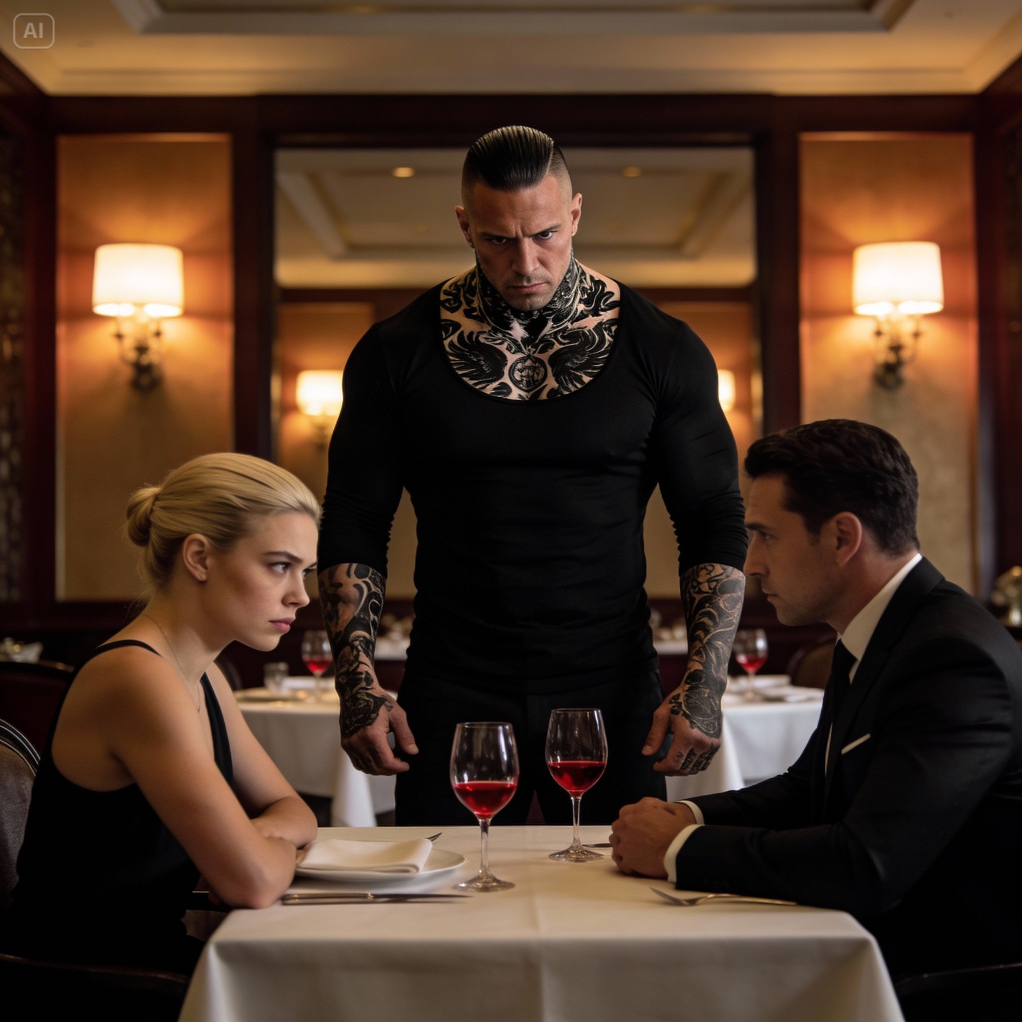 L’homme ne répondit pas. Il se contenta de regarder Thomas à nouveau. Et c’est à ce moment précis que l’atmosphère de la pièce changea véritablement. Ce n’était pas une intimidation par la colère. Il ne criait pas. Il ne faisait pas de scène. Il était simplement là, solide, immobile, certain. Le sourire de Thomas s’effondra. Il déglutit et chercha du regard un soutien inexistant. Le serveur le plus proche se figea en plein mouvement. Un couple à la table voisine trouva soudain ses assiettes fascinantes. Même le barman arrêta de polir un verre. L’assurance de Thomas fondit pour laisser place à la gêne.