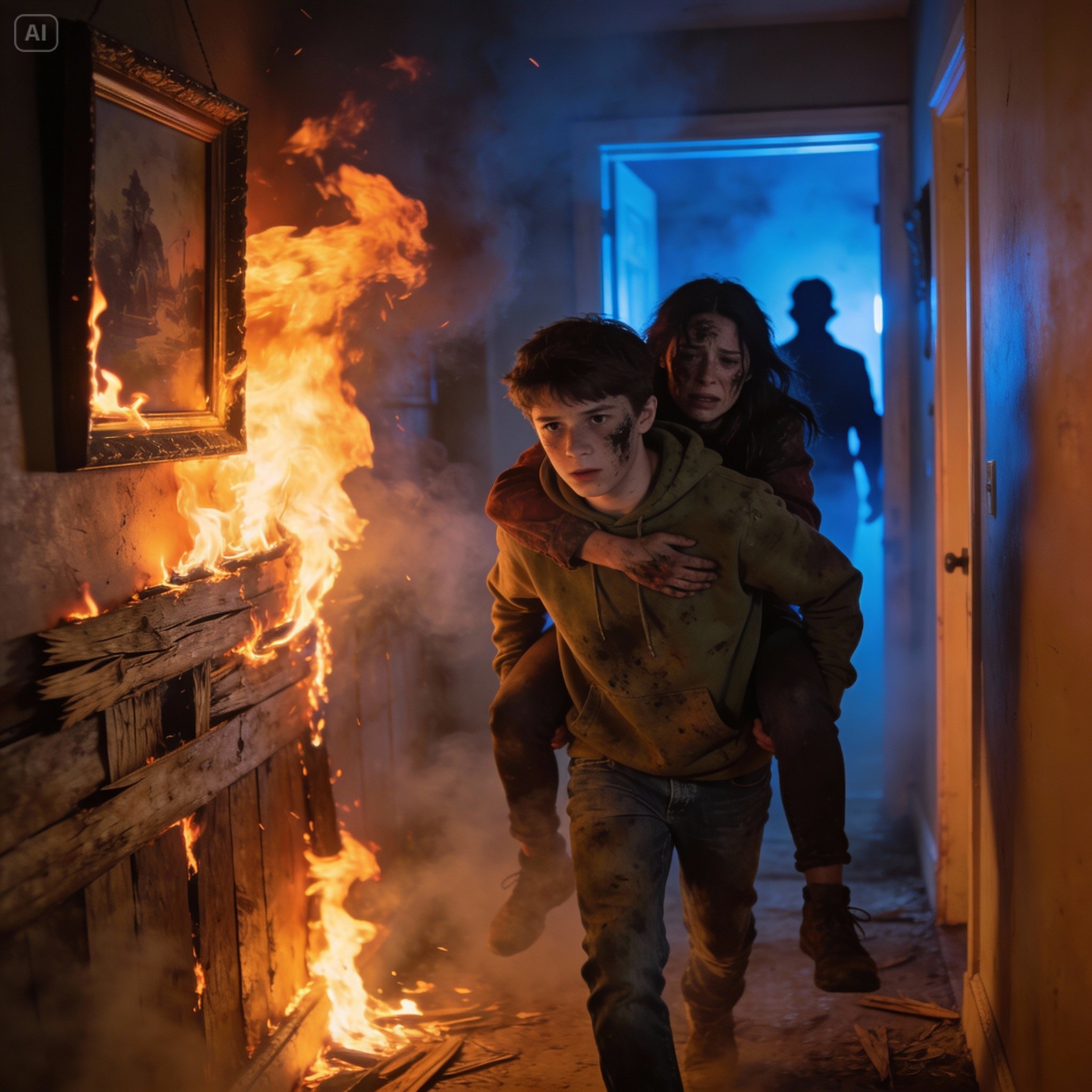 Il la saisit sous les bras et la souleva. Elle était plus lourde qu’elle n’en avait l’air. Un poids solide, obstiné, ses jambes chancelantes mais refusant de plier. Ils titubèrent ensemble vers la porte, la fumée s’épaississant à chaque pas. La chaleur les pressait de toutes parts, comme si la maison voulait les garder.