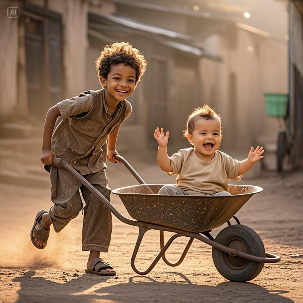 Raphaël, que tout le monde dans le quartier appelait « Raph », traînait derrière lui un sac en toile de jute grossière, usé jusqu’à la corde, qui pesait probablement plus lourd que lui. À huit ans, Raph avait le visage d’un enfant mais le regard d’un vieillard. Ses cheveux bruns, emmêlés par la poussière et la sueur, tombaient sur un front barré de soucis trop grands pour son âge. Son t-shirt, autrefois bleu marine, n’était plus qu’un haillon grisâtre collé à son dos squelettique, et son pantalon, trop court, laissait voir des chevilles écorchées et des pieds nus, dont la plante avait fini par se transformer en cuir à force de marcher sur le verre brisé et le béton brûlant.