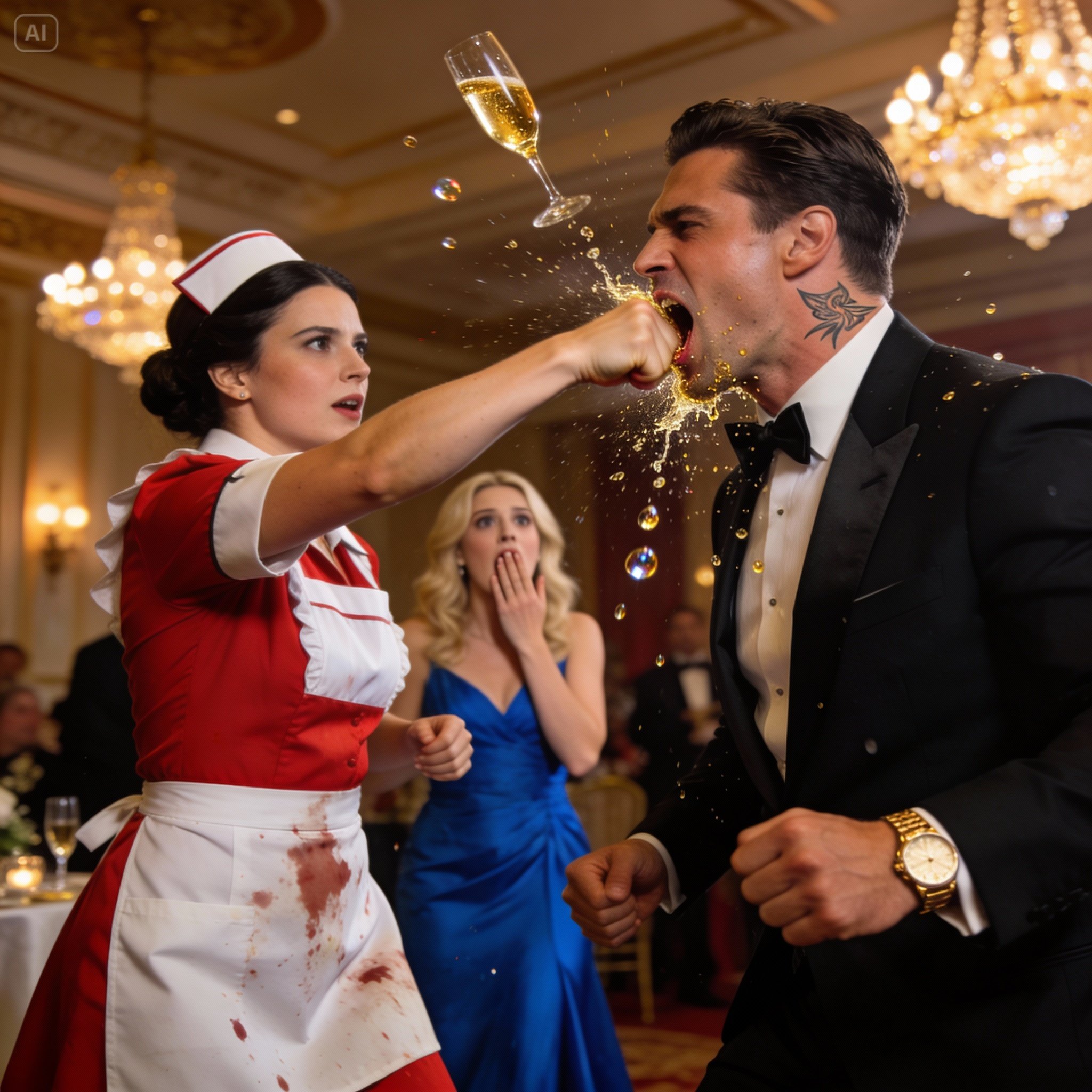 Une jeune serveuse passa accidentellement au moment exact où Victoire posait, bloquant la vue de l’appareil photo. Victoire se retourna, ses yeux bleus glacials et perçants. « Êtes-vous aveugle ? » siffla-t-elle, sa voix venimeuse. « Ou votre cerveau est-il aussi vide que le plateau que vous portez ? » La serveuse trembla et baissa la tête en s’excusant. Mais Victoire n’avait pas fini. Elle s’approcha et, sans un mot d’avertissement, gifla la fille violemment au visage. Le son claqua dans le hall, figeant tout le monde sur place. « Regardez où vous allez la prochaine fois, » dit froidement Victoire, puis elle se détourna comme si elle venait de brosser de la poussière de sa robe.