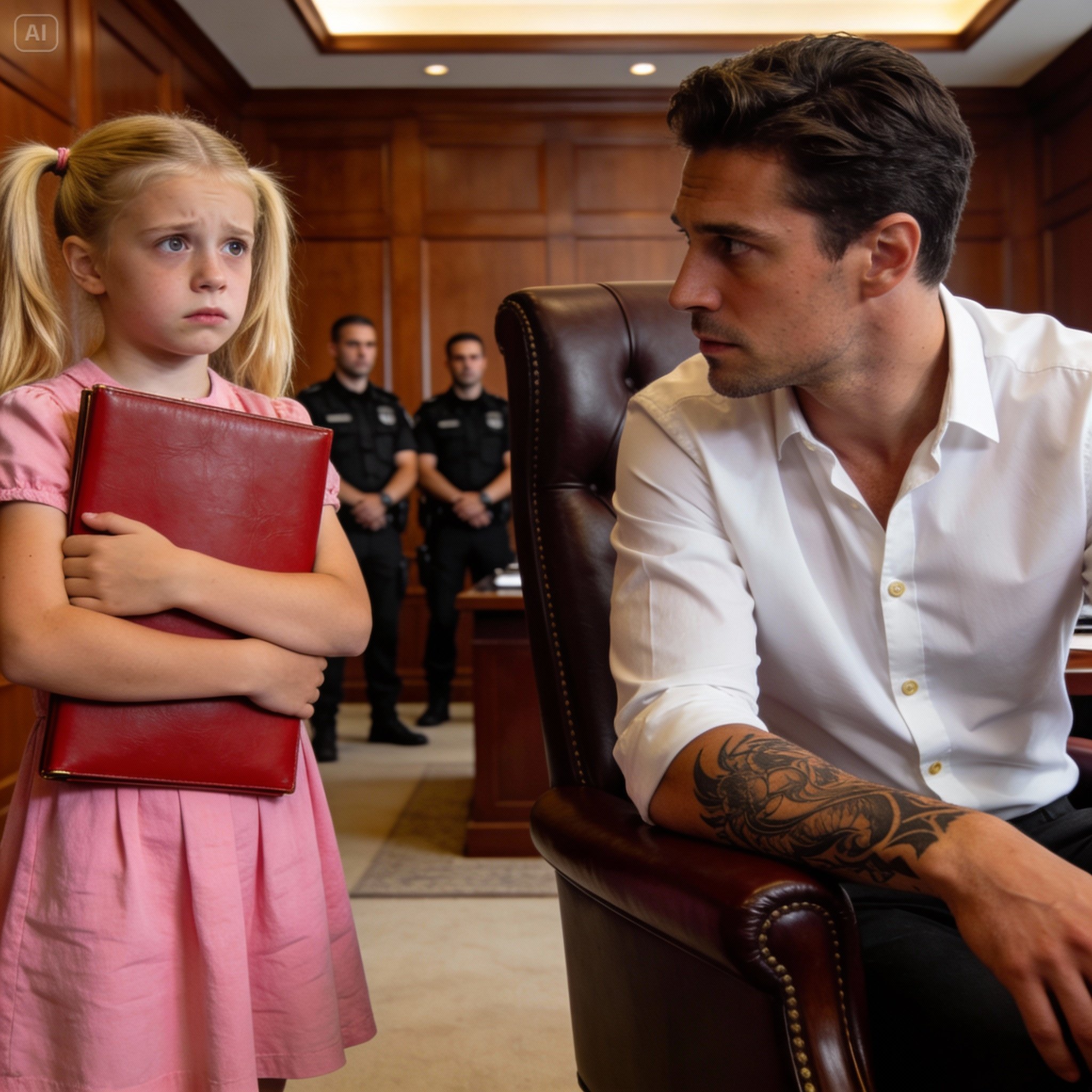Lá, no centro de seu saguão de mármore, cercada por sua equipe de segurança e funcionários da recepção, estava a pessoa mais pequena que ele já vira naquele prédio. Uma garotinha, talvez de cinco anos, tranças loiras, um vestido rosa-pálido com gola branca, e em suas mãos, segurada como um escudo, uma pasta de couro vermelha quase tão grande quanto ela.