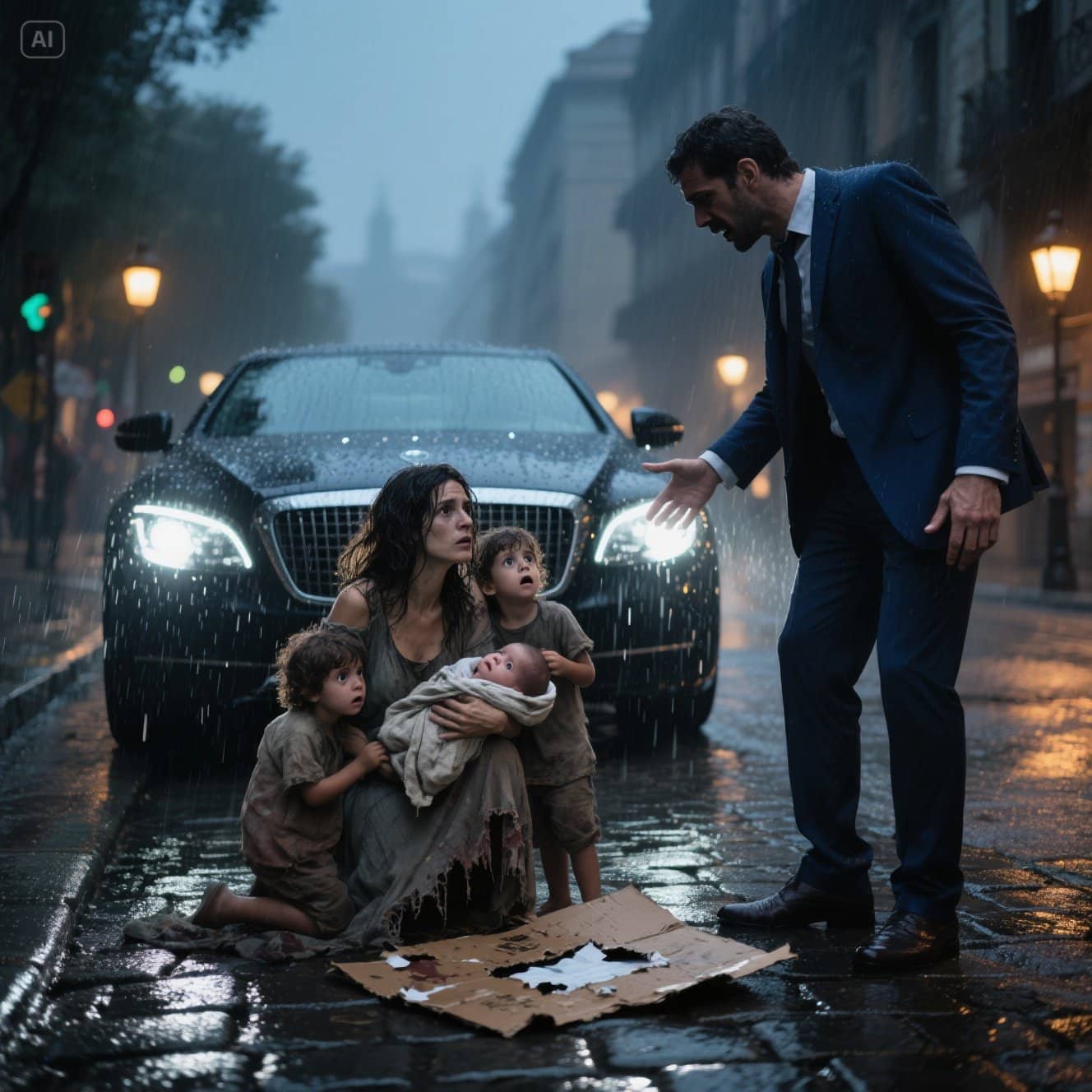 Num canto, sob a frágil proteção de um toldo rasgado de uma loja fechada, um grupo de pessoas se amontoava. Um pedaço de papelão encharcado servia de chão. Uma mulher estava sentada ali, curvada, como se o peso do mundo lhe tivesse quebrado a coluna. Ela apertava um embrulho em trapos sujos contra o peito. Ao seu lado, duas crianças pequenas se encolhiam junto a ela, tremendo de frio.