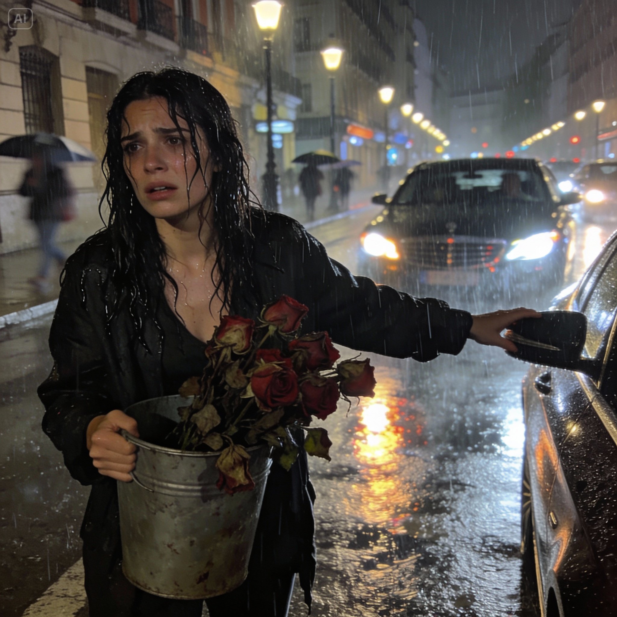 O taxista me viu. Viu minhas roupas encharcadas, grudadas no meu corpo como uma segunda pele. Viu o balde de flores barato. Viu o desespero selvagem nos meus olhos.