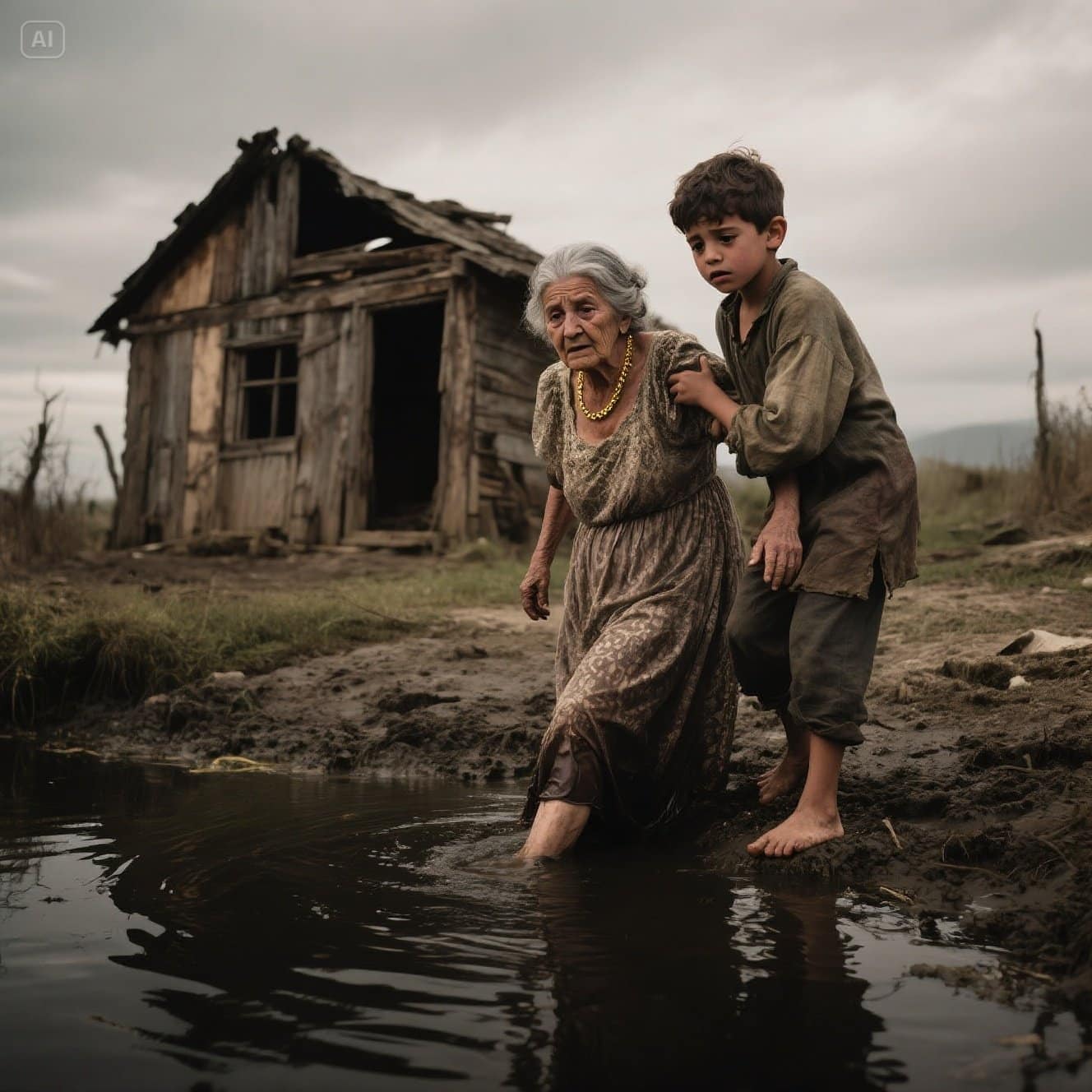Quando finalmente chegou em terra firme, arrastou a mulher pela lama. Ela tossiu, cuspiu água e lutou para respirar. O corpo da velha estava frio e imóvel, mas ela respirava fracamente. “Por favor, não morra”, sussurrou ele, com lágrimas se misturando à água do rio.