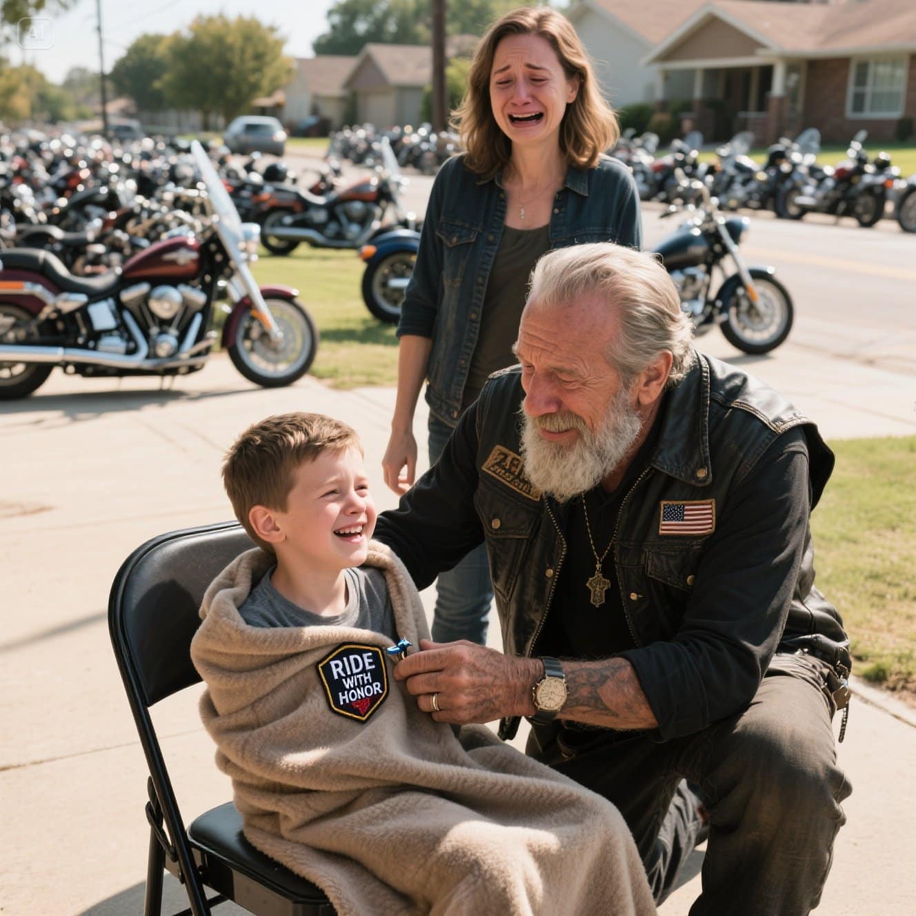 Liam não estava mais apenas assistindo. Ele estava vivo de um jeito que eu não via há mais de um ano. Ele batia palmas com suas mãozinhas frágeis, seu riso escapando entre tosses, tão cheio de alegria que ele mal conseguia respirar. Cada motociclista que passava diminuía a velocidade, olhava diretamente para ele e fazia uma saudação. Alguns buzinavam em uma homenagem rítmica. Outros aceleravam os motores, um rugido profundo de respeito. E por baixo dos capacetes, vozes gritavam: “Feliz aniversário, Liam!” e “Você é o cara, pequeno lutador!”
