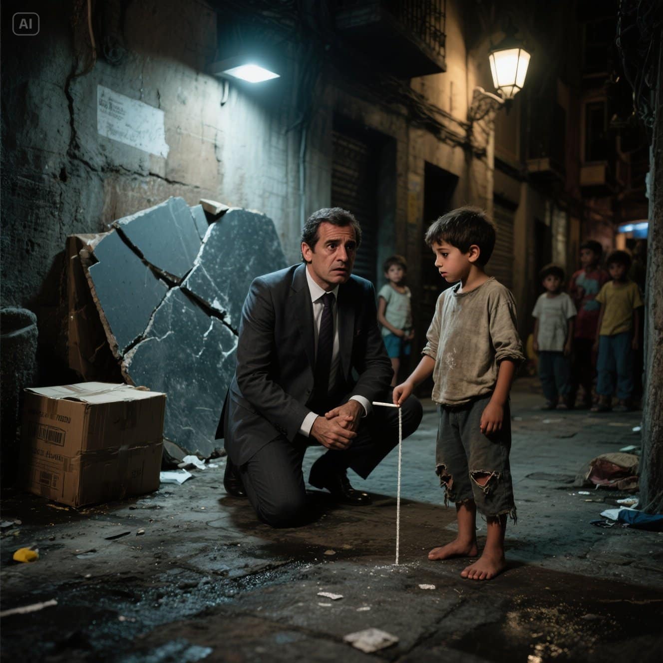 A princípio, meu cérebro, acostumado a filtrar tudo que não fosse diretamente relevante para meus interesses, quase descartou aquilo como ruído de fundo. Mas algo me fez olhar duas vezes. Era um beco tenuemente iluminado por um poste de luz que piscava intermitentemente, ameaçando se apagar a qualquer momento. E naquele beco estava um grupo de figuras pequenas. Crianças.