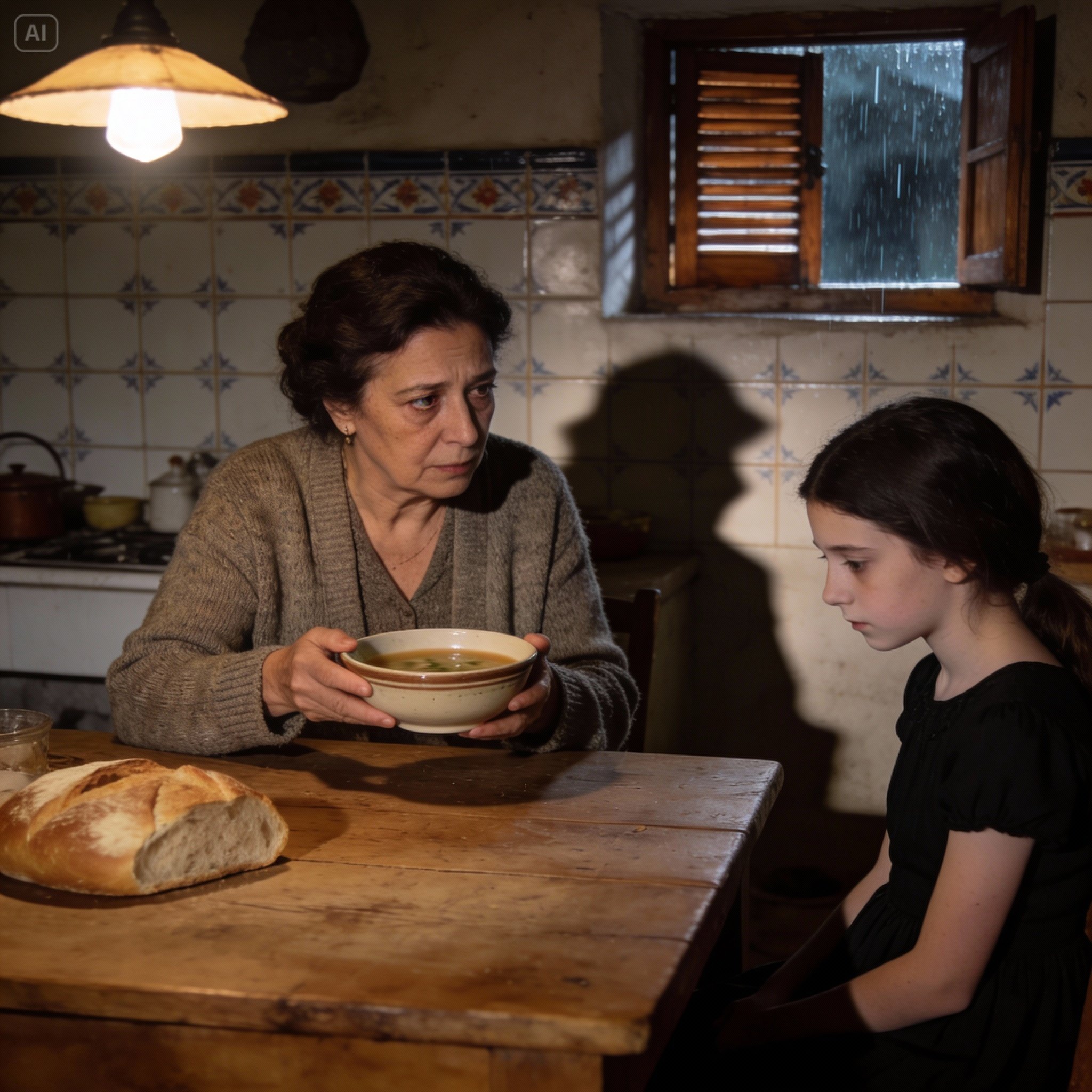 For a long time, neither of them spoke. I ate slowly; the clinking of my spoon against the ceramic was the only sound in the room, apart from the wind rattling the shutters.