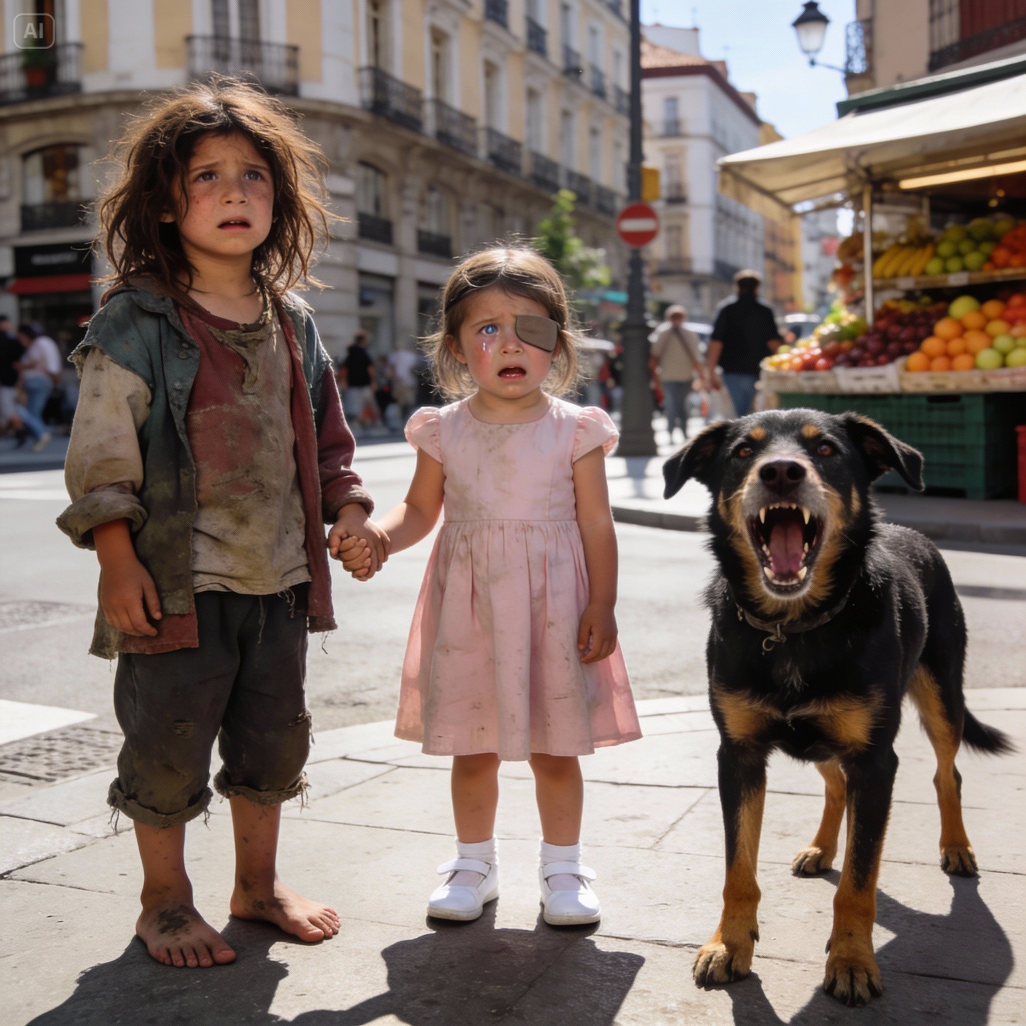 That March afternoon, the sun beat down on the asphalt of Madrid. It was one of those days when the air seems to vibrate and the smell of churros and coffee mingles with car exhaust. We were on our usual corner, near a fruit shop whose owner, Mr. Manolo, sometimes let us rest under the awning if we didn’t scare away the customers. I was counting a few coins, barely a few euro cents, keeping them like a treasure in the torn pocket of my jeans, when the sound tore through the air.