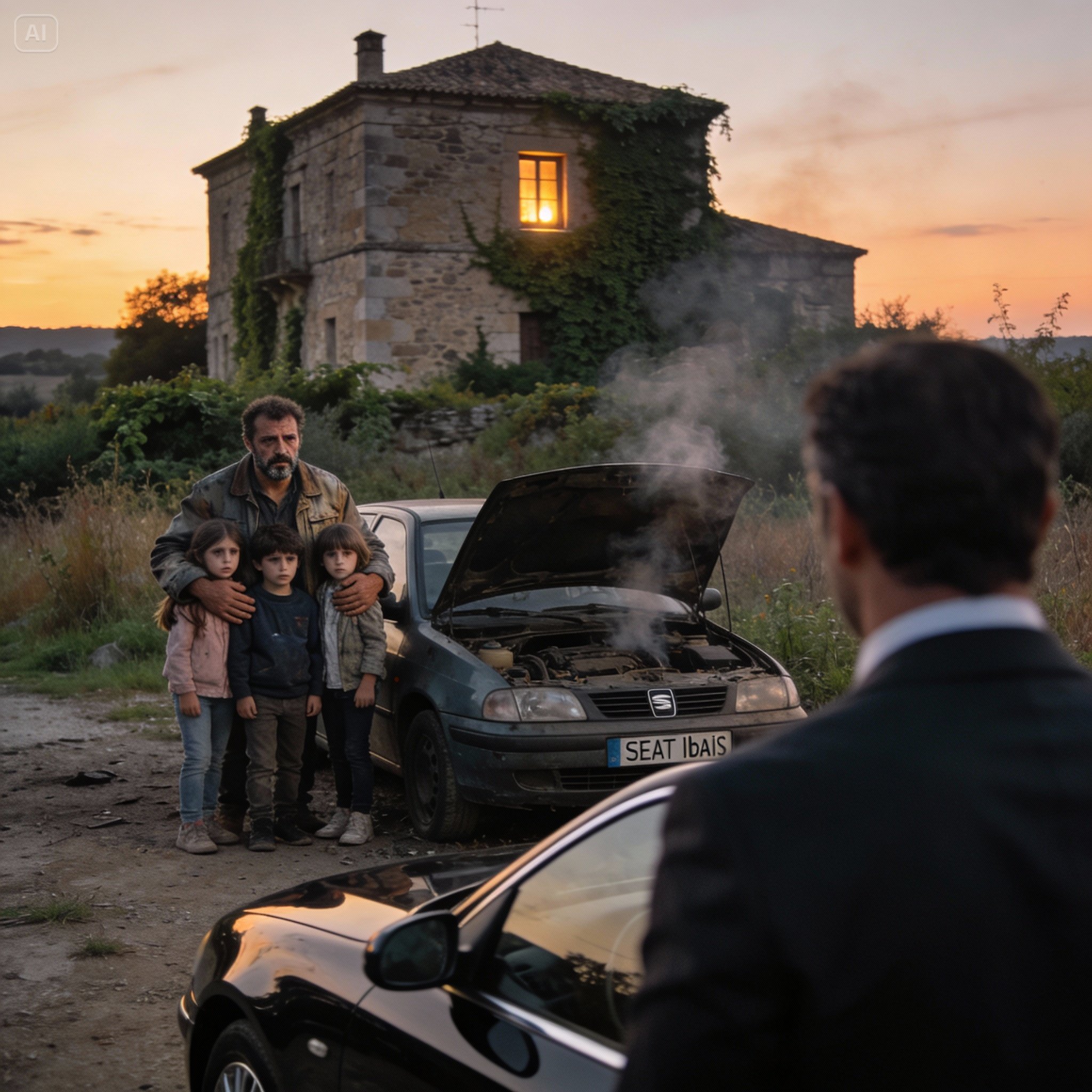 I was about to tell them to stop staring and try to get some more sleep when the car lurched violently. The engine coughed, a horrible, guttural, metallic sound, and the dashboard lights flickered before going out completely. The old Ibiza died right on the gravel shoulder, in front of the entrance to the abandoned house, enveloped in a cloud of white smoke billowing from under the hood.